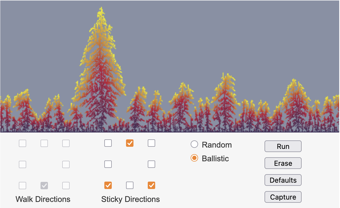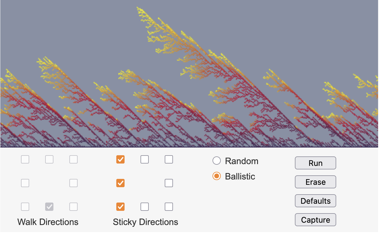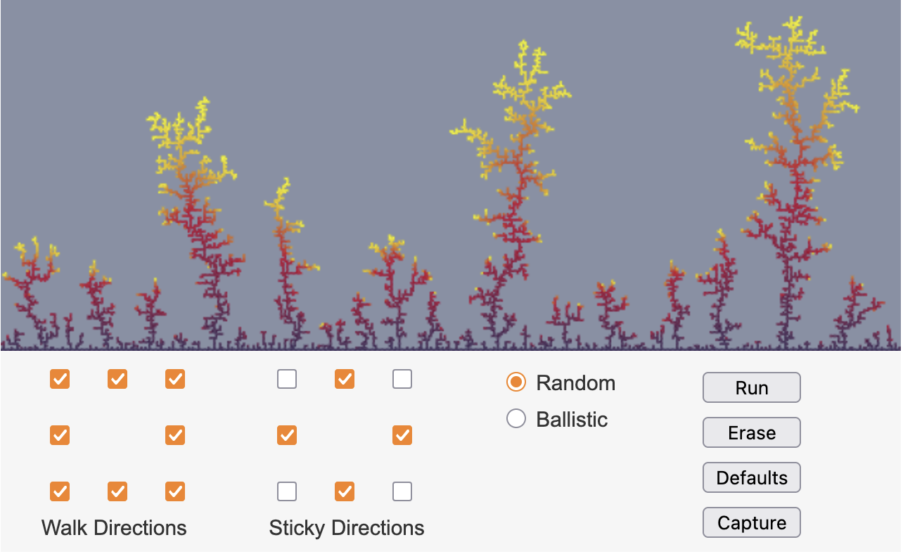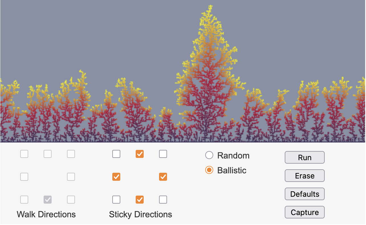 The other set of checkboxes, labeled “Sticky Directions,” pertains to the particles that have already been deposited. These checkboxes determine which sides of a settled particle are sticky and can therefore capture a new descending particle. For example, if only the top middle box is checked, then roving particles can adhere only if they happen directly on top of a settled particle.